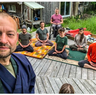 Le matin, zazen (sur mon sac de couchage embobiné sur lui-même). Puis toujours sur un parterre encore humide : trois prosternations en direction du Ryumonji. Et dans cette concentration de zazen, rangement méthodique, imbrication logique.